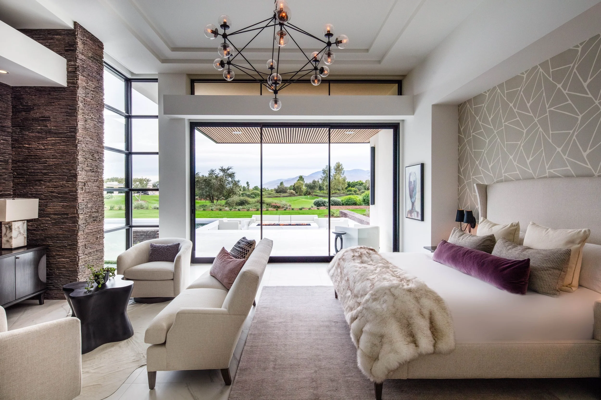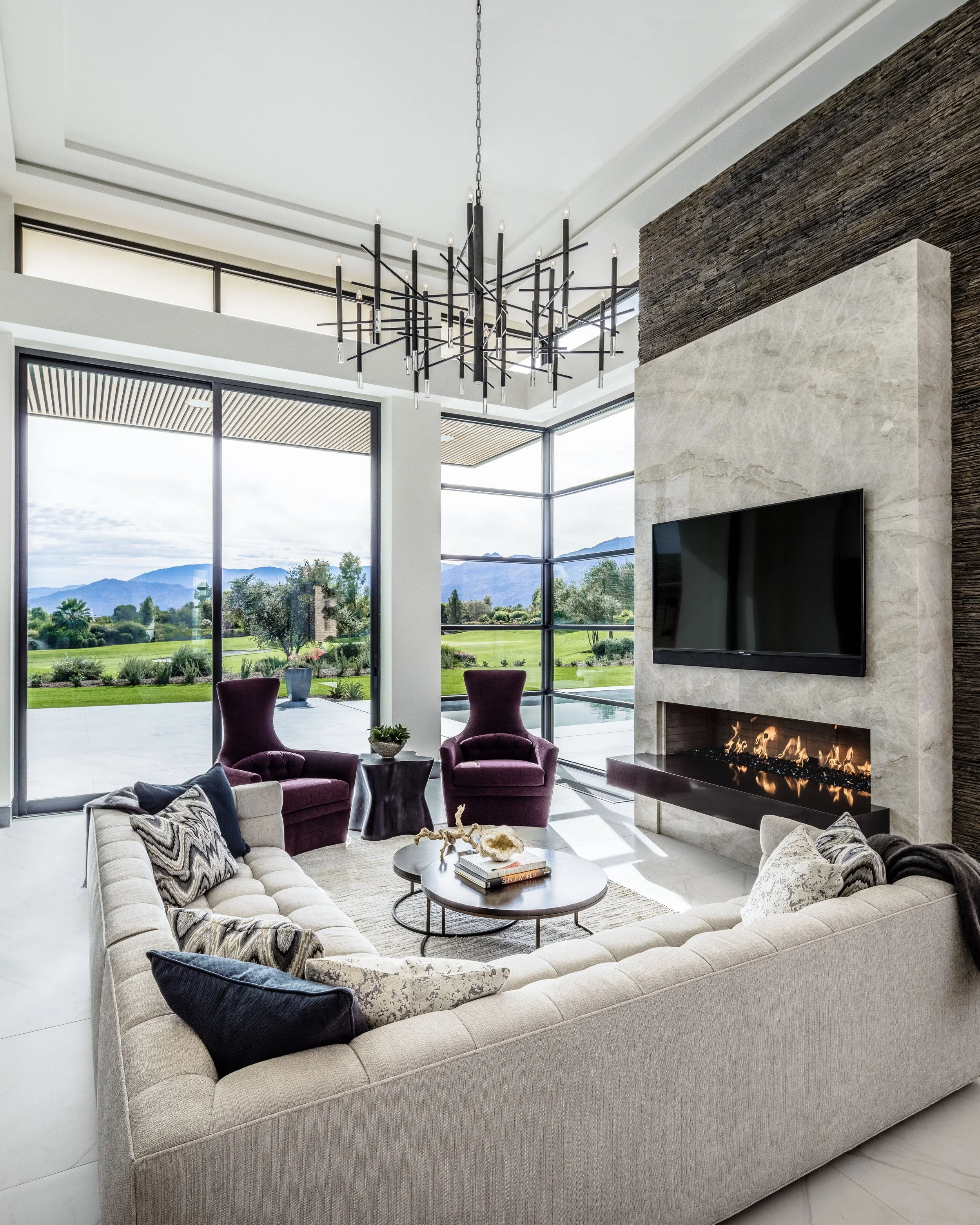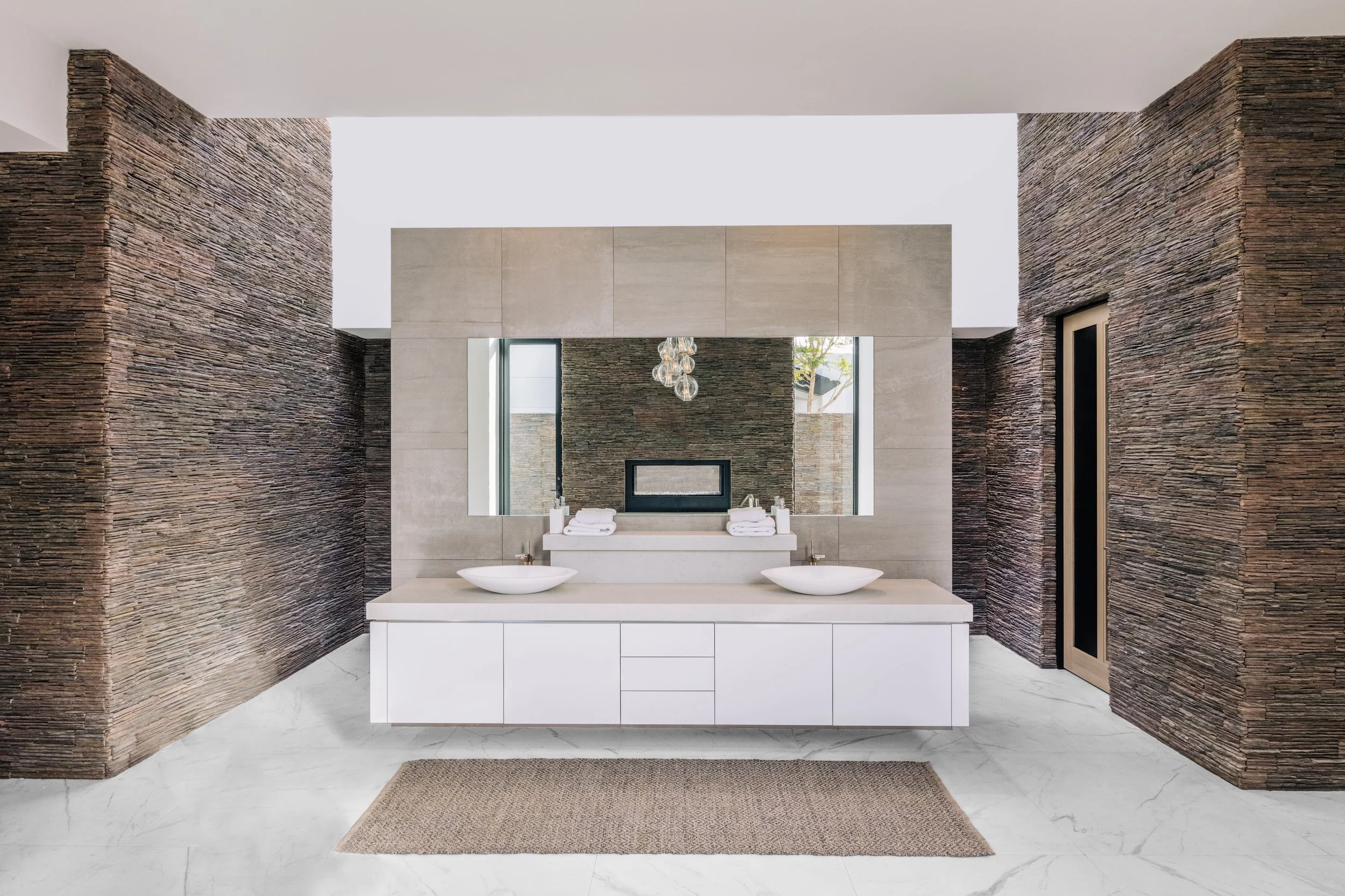 With mountain views and desert colors to pull from, we were able to create a distinctive interior palette of colors, textures, and patterns to amplify the desert living experience. Using slabs of natural stone and marble, then combining them with textures found in desert hues and indigenous plants, we produced contrasts to the outside world and recreated the light play that is so intriguing in the desert.